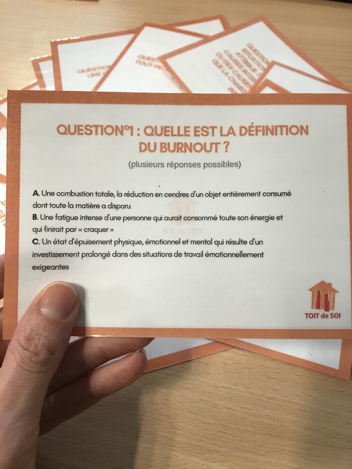 Nous avons proposé aux participants de répondre dans un premier temps à une série de questions, au travers d’un jeu de cartes, qui illustraient les définitions et les composantes clés du burnout, bore-out et brownout.