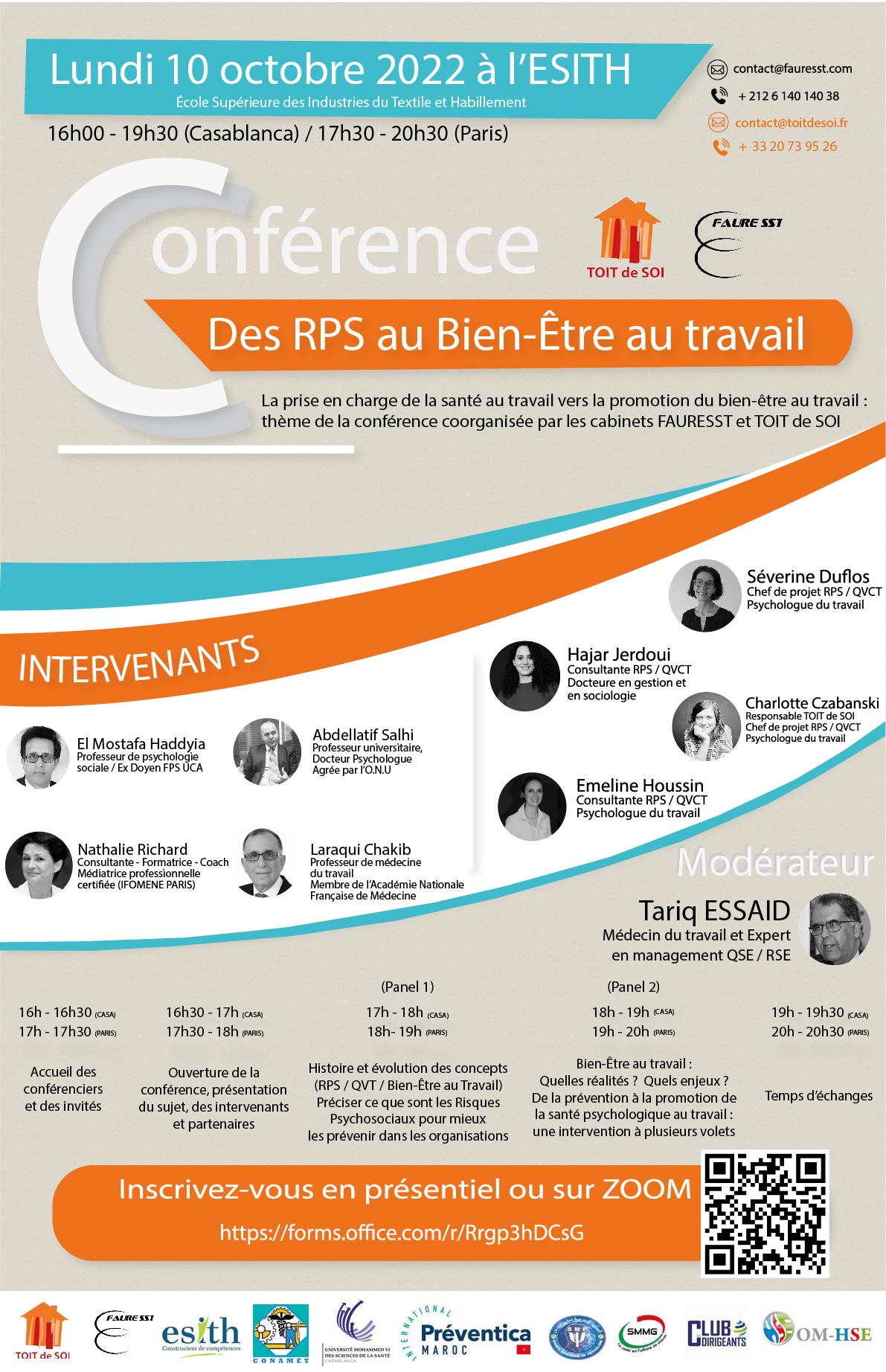 TOIT de SOI s’envole prochainement pour un séminaire au Maroc. L’occasion pour le cabinet de réaliser une conférence sur la thématique « Des RPS au Bien-Être au travail » en collaboration avec le cabinet marocain Faure SST. Celle-ci sera accessible en présentiel en direct de Casablanca, et à distance via zoom. direct de Casablanca. Pour s’inscrire, il vous suffit de suivre le lien suivant : https://forms.office.com/r/Rrgp3hDCsG